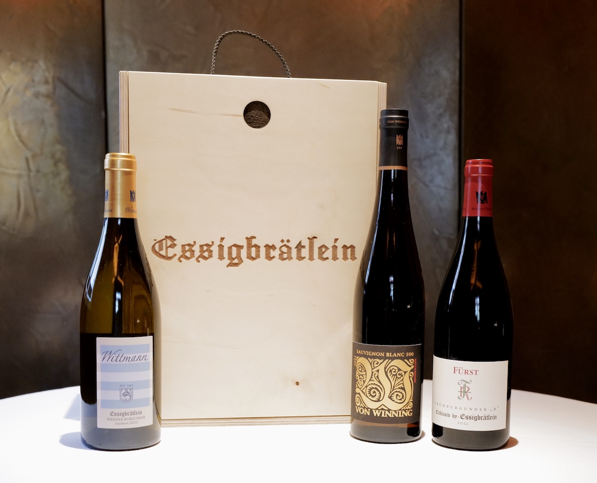 30 Weinkisten mit je 3 besonderen Weinen stehen für Sie bereit, ausgewählt von unserem Sommelier Ivan Jakir und seinem Team. Sie haben sich in den vergangenen Jahren wieder durch die Keller unserer Lieblingswinzer probiert und gemeinsam mit Philipp Wittmann und Sebastian Fürst exklusive Essigbrätlein-Weine cuvéetiert. Im Weingut von Winning hatten wir die Qual der Wahl des besten Fasses, speziell und komplett für das Essigbrätlein.